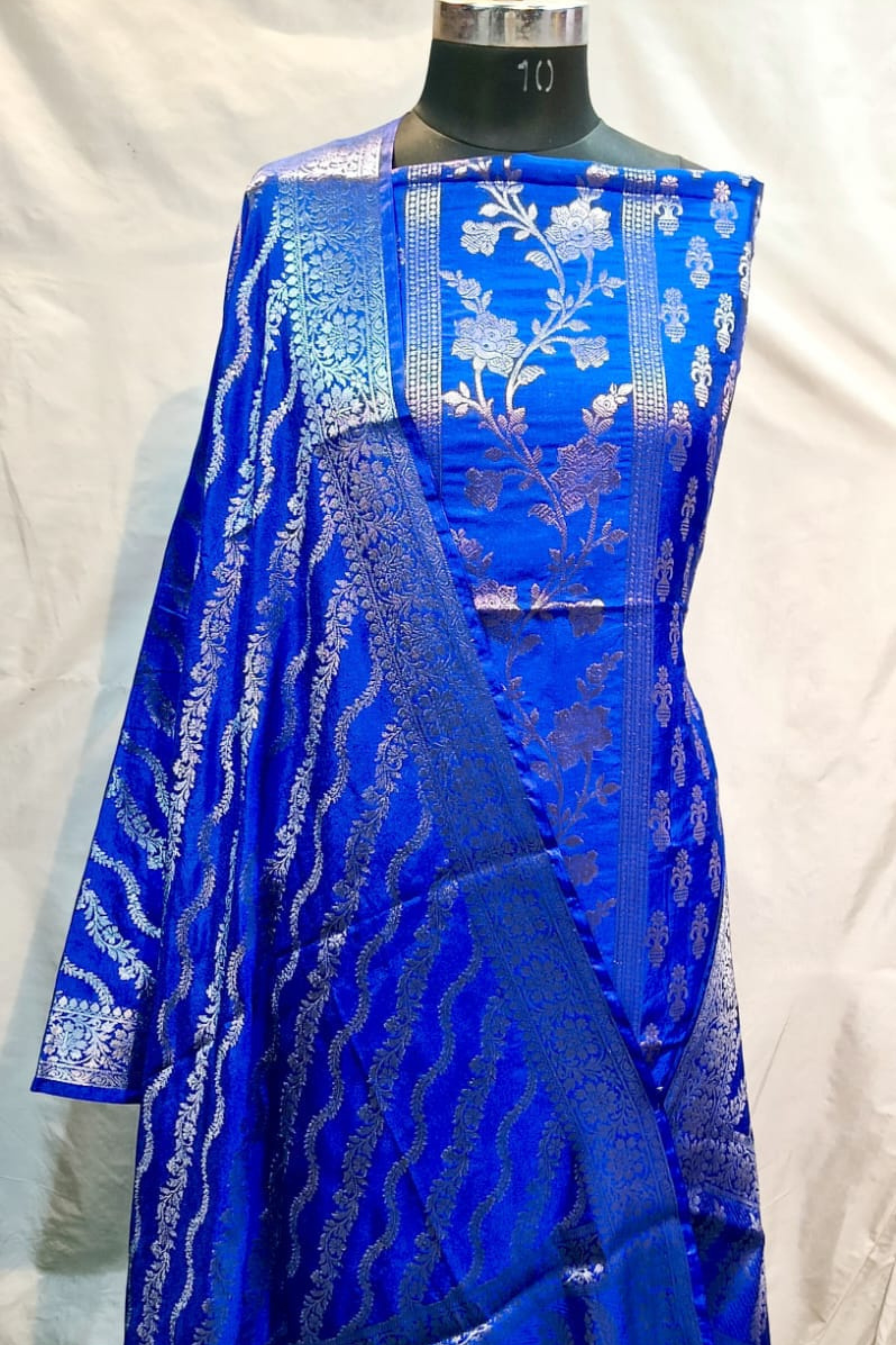 Experience both tradition and present-day elegance in this Royal blue banarasi katan salwar suit--a memorable outfit that is sure to make you stand out in any event.