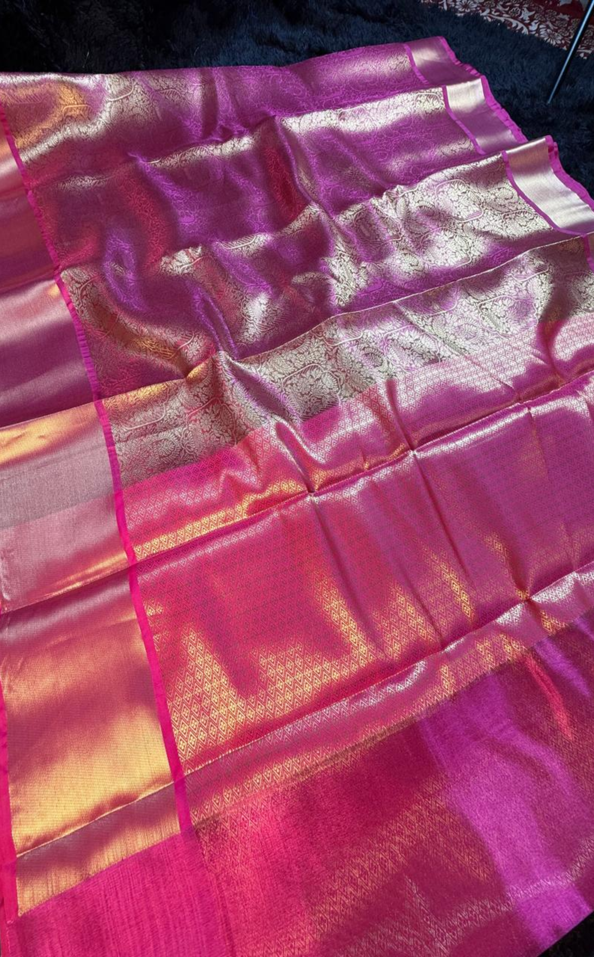 A beautiful dark pink tissue silk saree that looks bright and classy for any special day. The contrast border adds a nice touch, making the saree look even more graceful. The colour is so attractive that it makes you stand out and feel really good when you wear it.