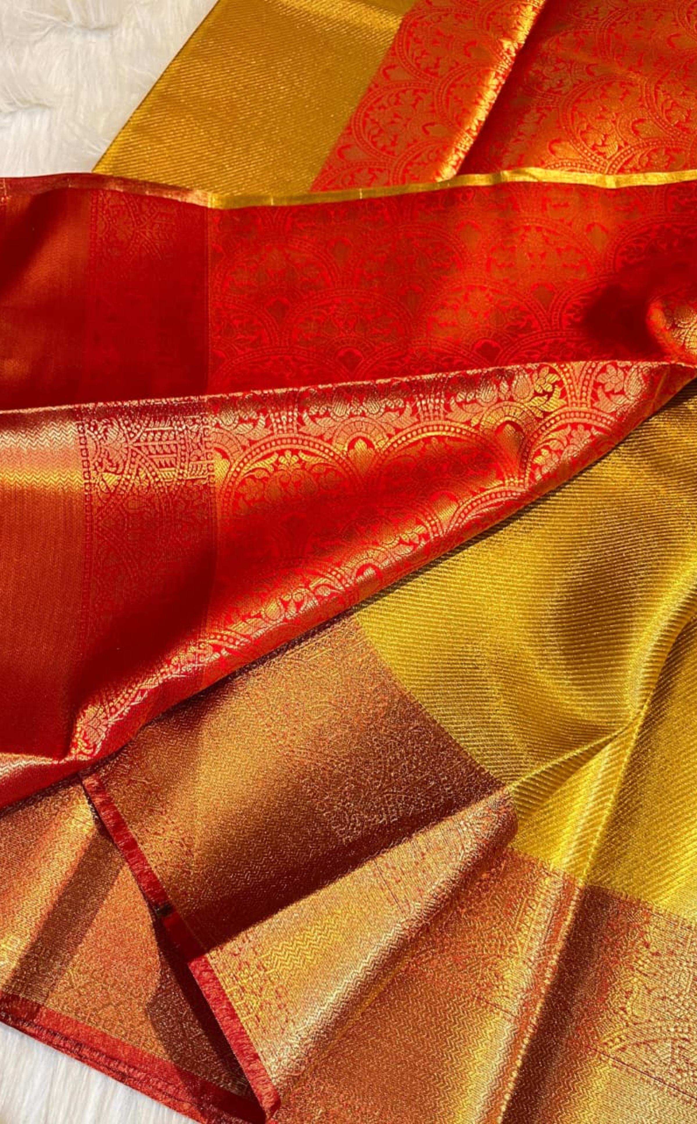 A classy gold tissue silk saree with a bright red contrast border that gives a beautiful and elegant ethnic look. The colour mix looks very attractive and makes you stand out at any event with a confident feel. The matching pallu and blouse complete the saree perfectly in good quality.