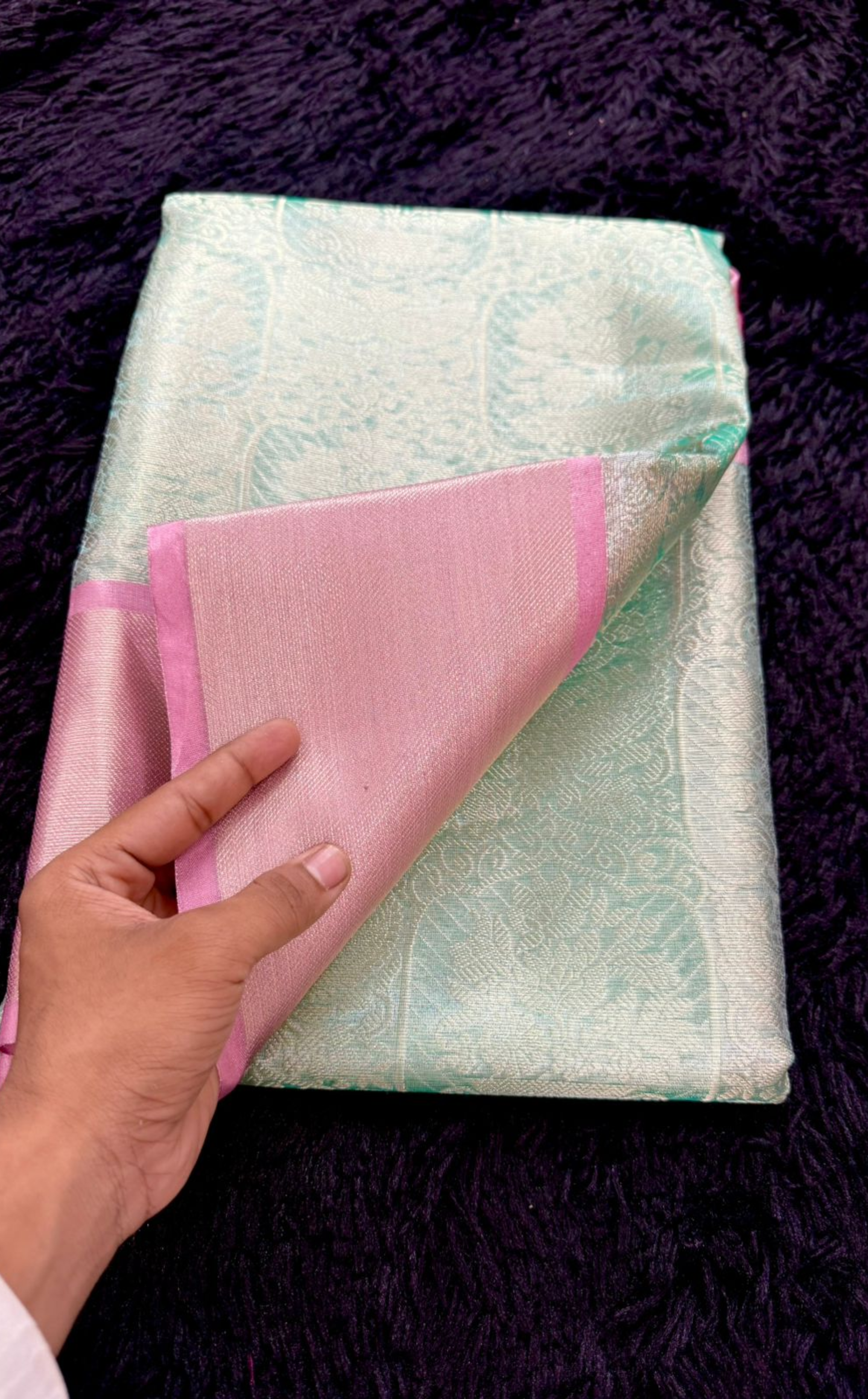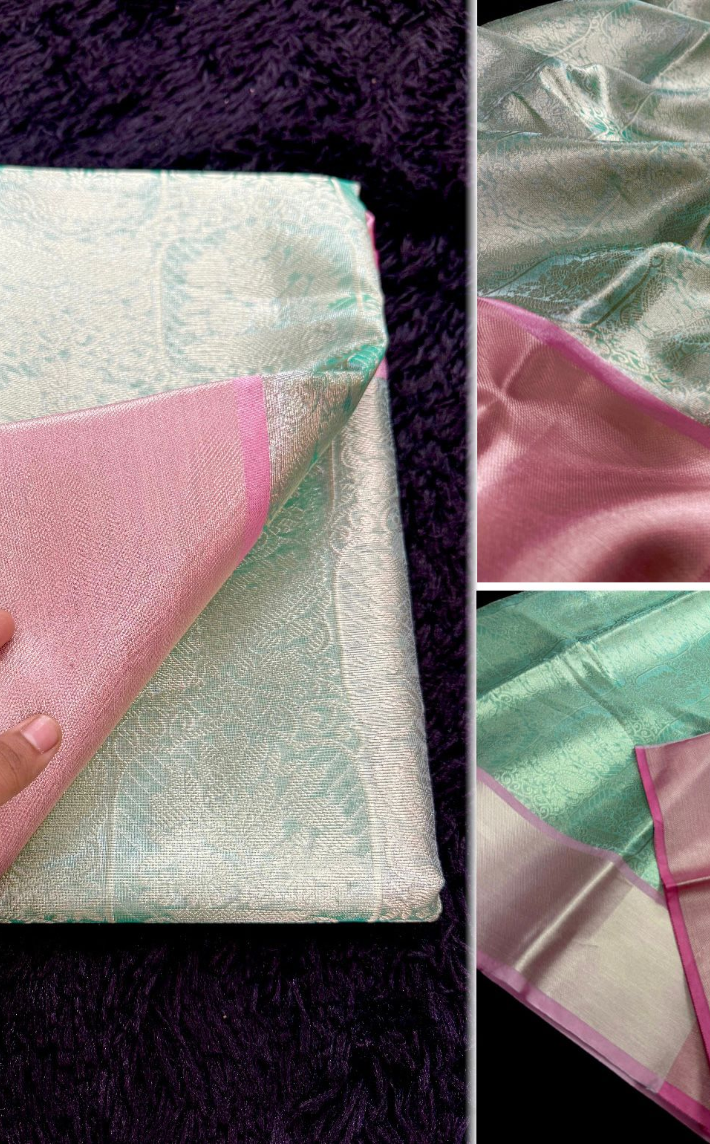 A very pretty tissue silk saree in a lovely teal green colour with eye-catching pink borders that give a rich traditional look. The matching pallu and blouse make the whole outfit look neat and elegant. The soft colour and simple design make you feel confident and special on any occasion.