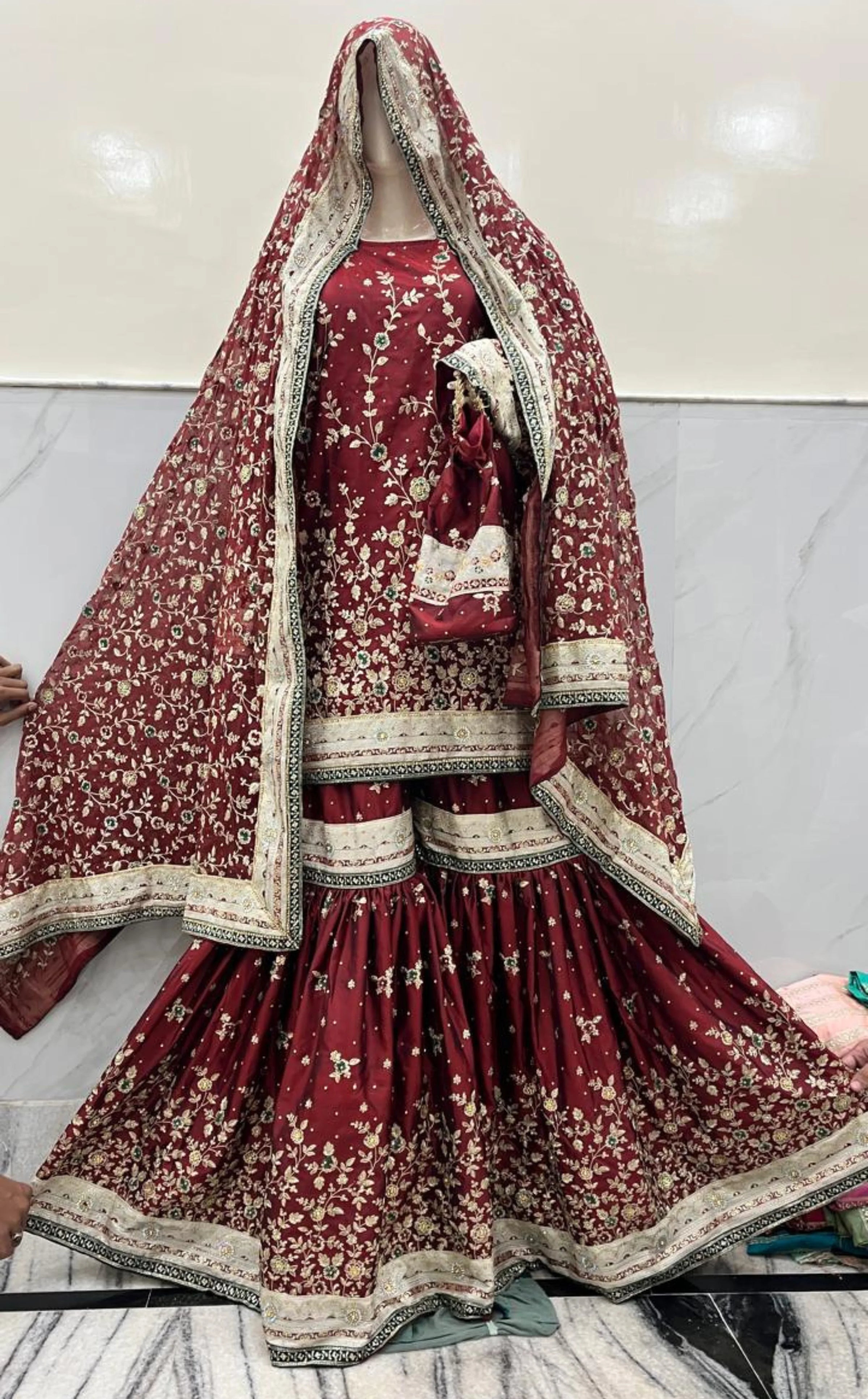 This Bridal & Party Wear Banarasi Katan Silk Gharara Set features a deep maroon top with gharara pants and a matching scarf and will surely stand out making it a perfect combination of color: Very rich monochrome with great sophistication for weddings, festivities, and larger-than-life celebrations.