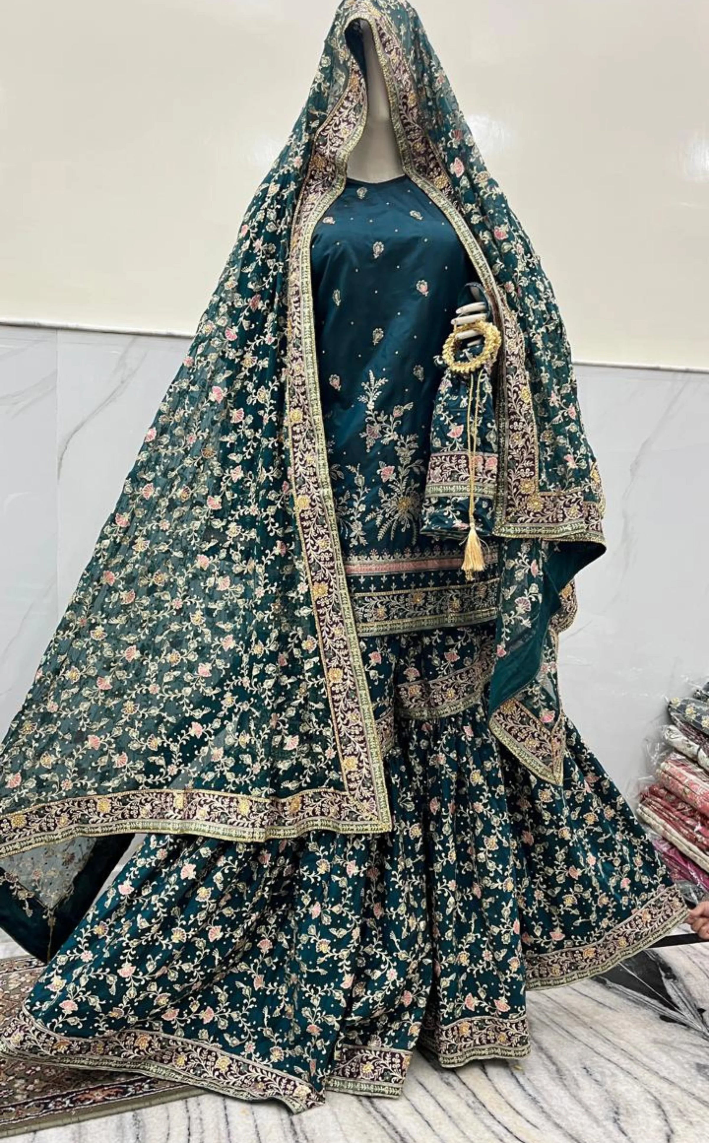 This simply majestic bridal and party wear Banarasi Katan silk Gharara set drapes the wearer in graceful royal blue from top to bottom. The top and matching gharara pant come in exquisitely woven Banarasi Katan silk, thus enhancing the rich look with a complementary dupatta.