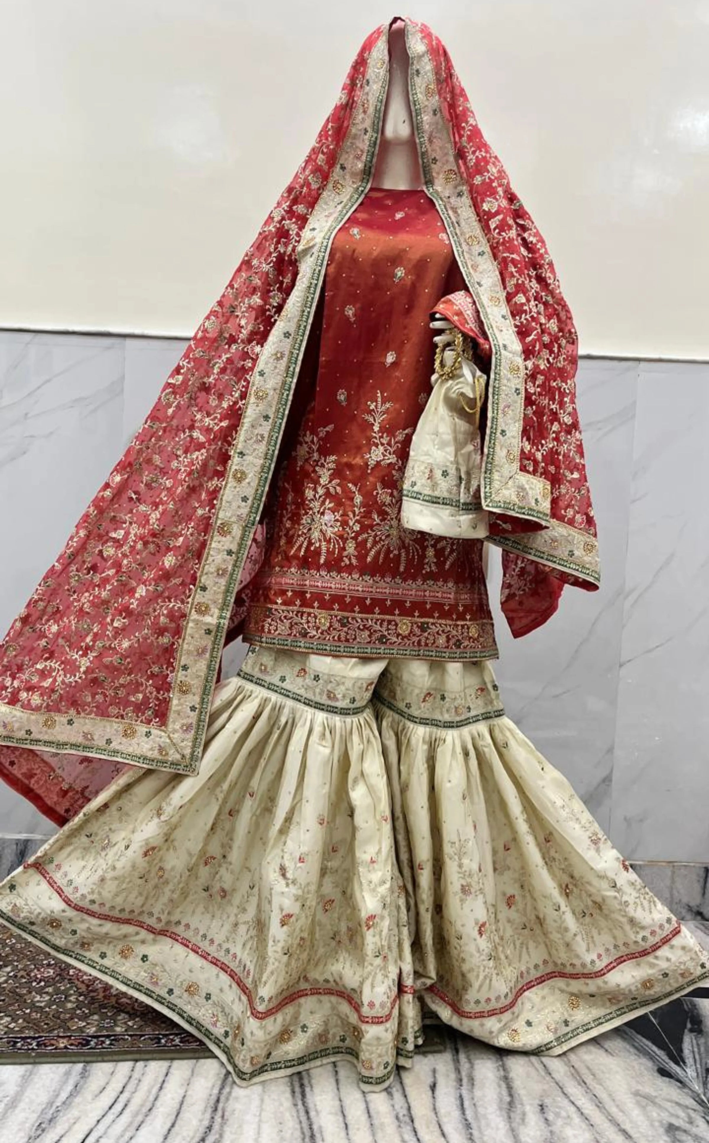 The Banarasi Katan Silk Gharara Set in Red and White with Dupatta - Royal Stitches in Every Thread.