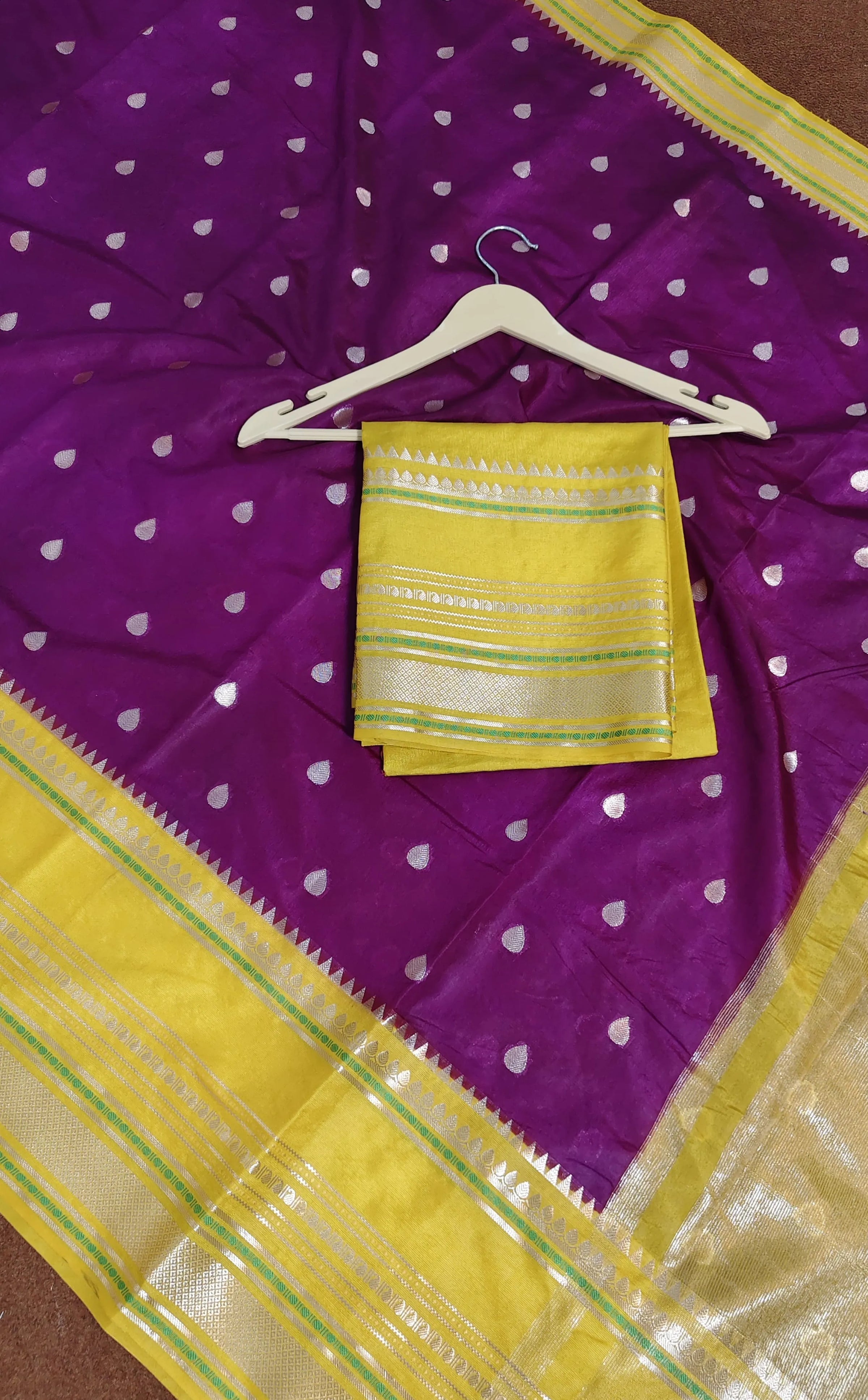 Purple and Yellow Banarasi Semi Katan Soft Silk Saree