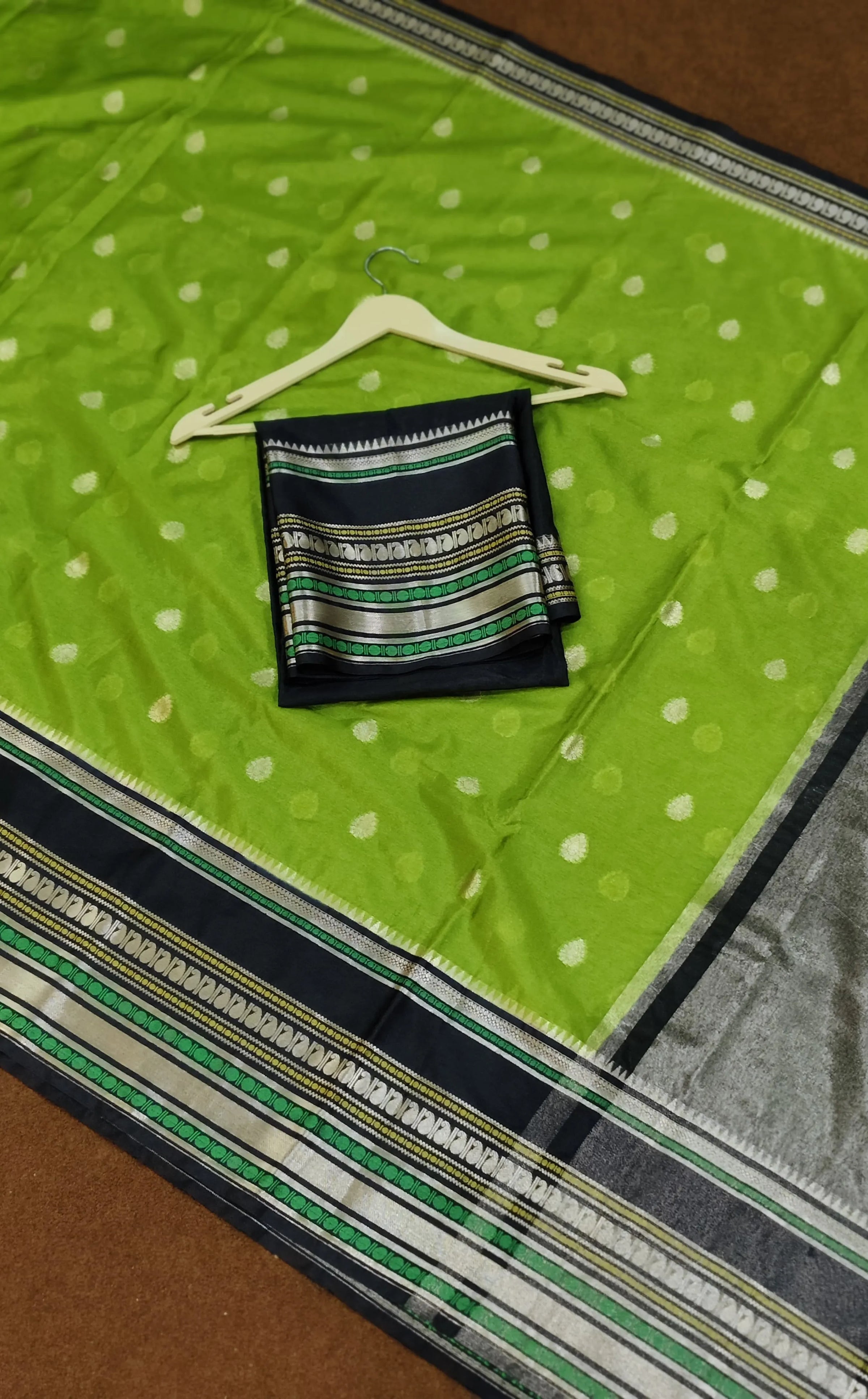 The bright parrot green is refreshing and lively whereas the deep black is contrasting and everlasting, hence perfect in weddings, festive or evening parties. Its contrast pallu and blouse form the luxurious image so that you stand out gracefully in every occasion.