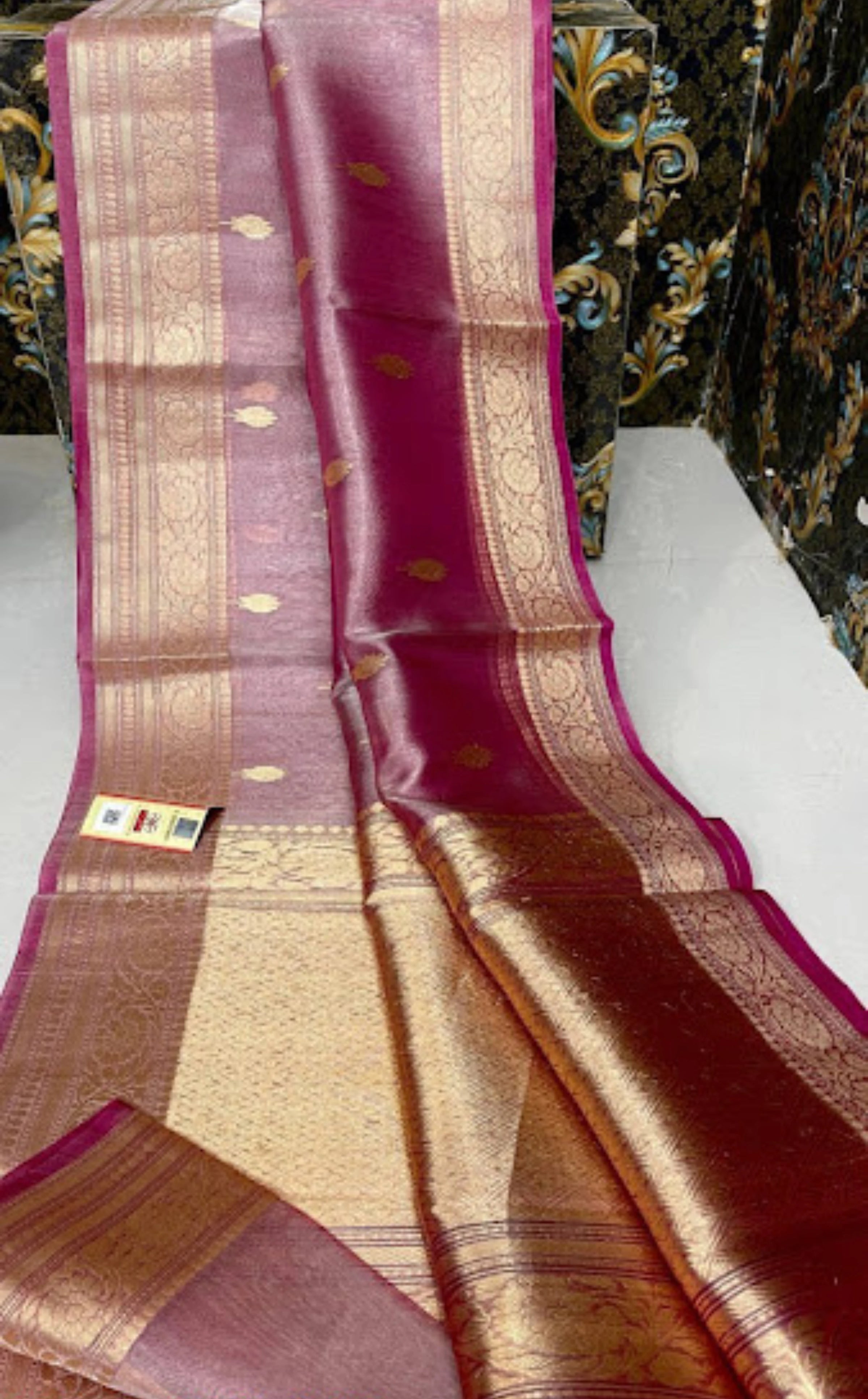 Saree: 5.50 m high quality copper tissue silk woven with detailed intricate zari of 30 numbers that gives it a glossy metallic surface and fine finishing. The textile provides a light, draped garment with a luxurious, classy touch.