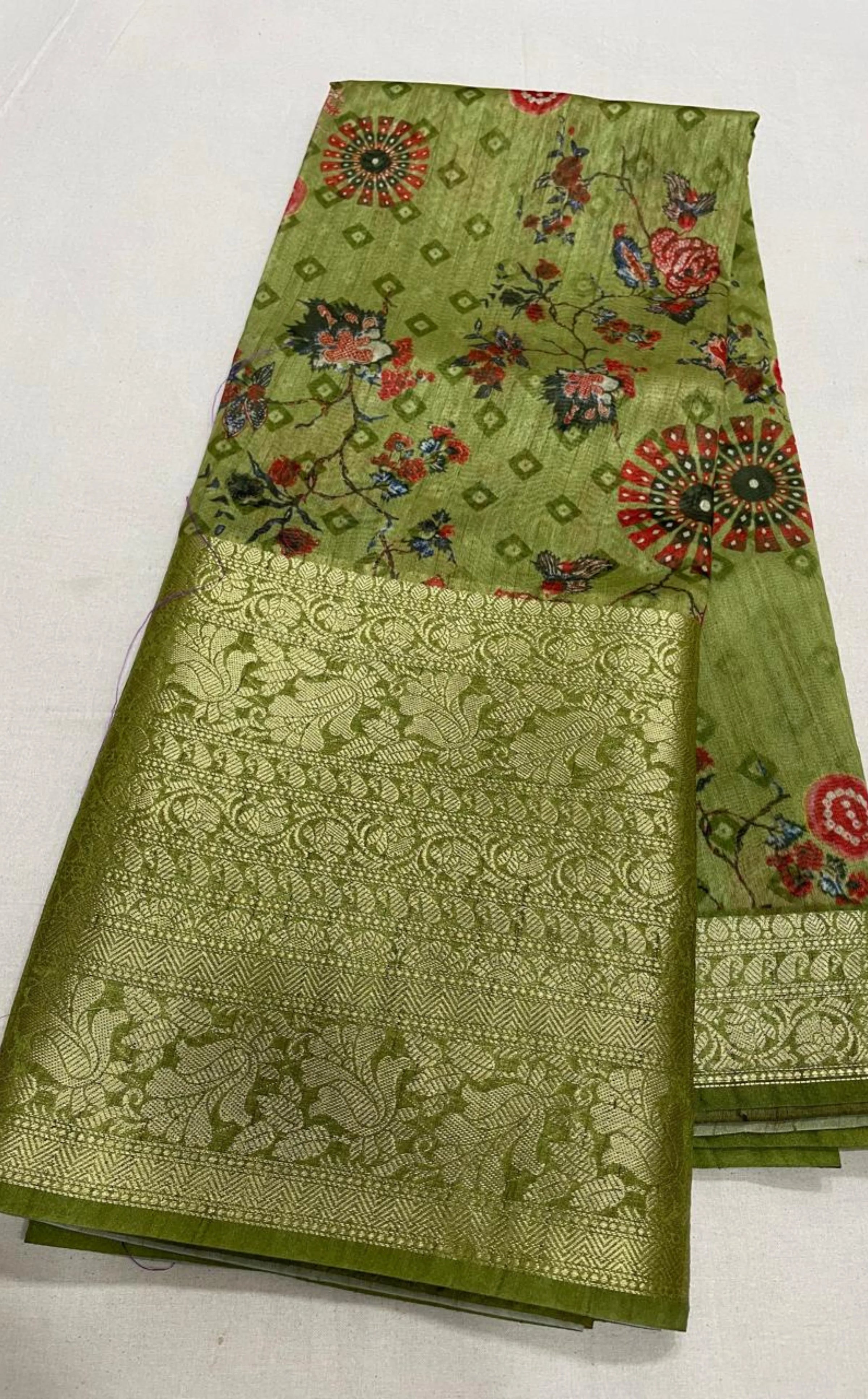 Green Floral Semi-Banarasi Silk Saree with Printing