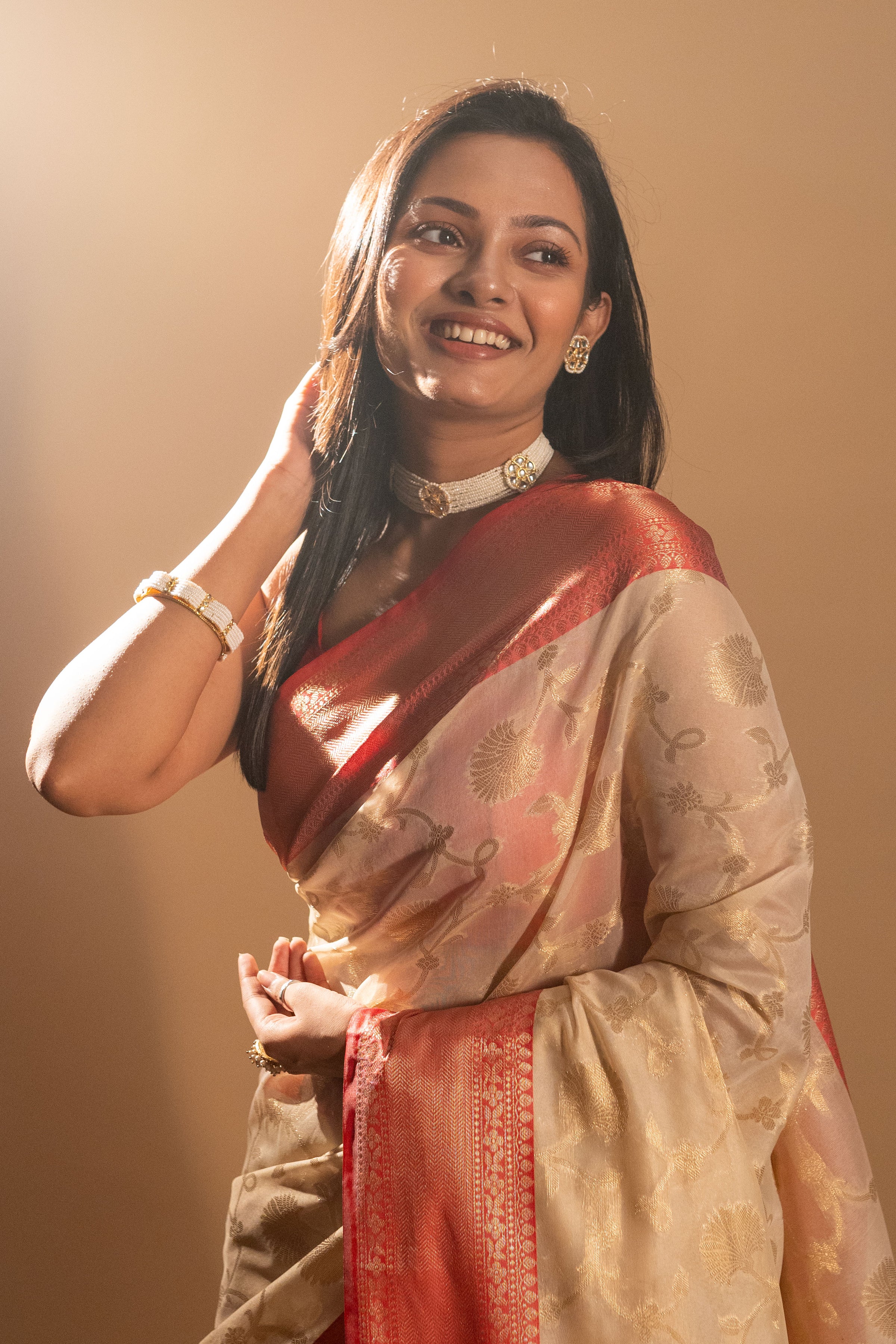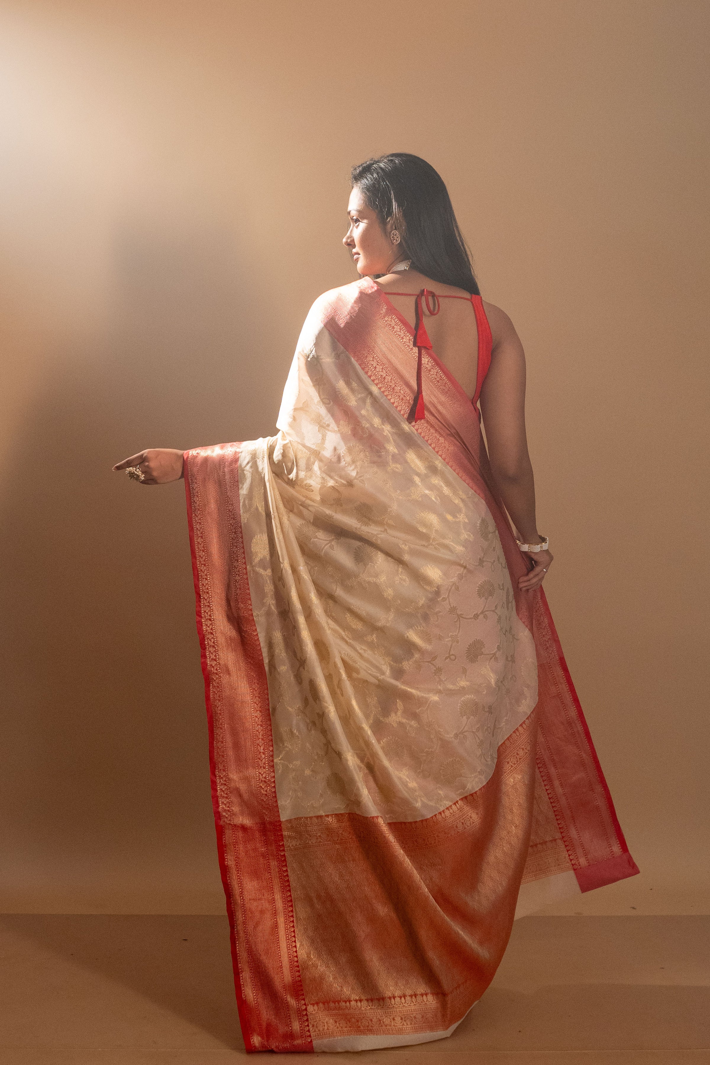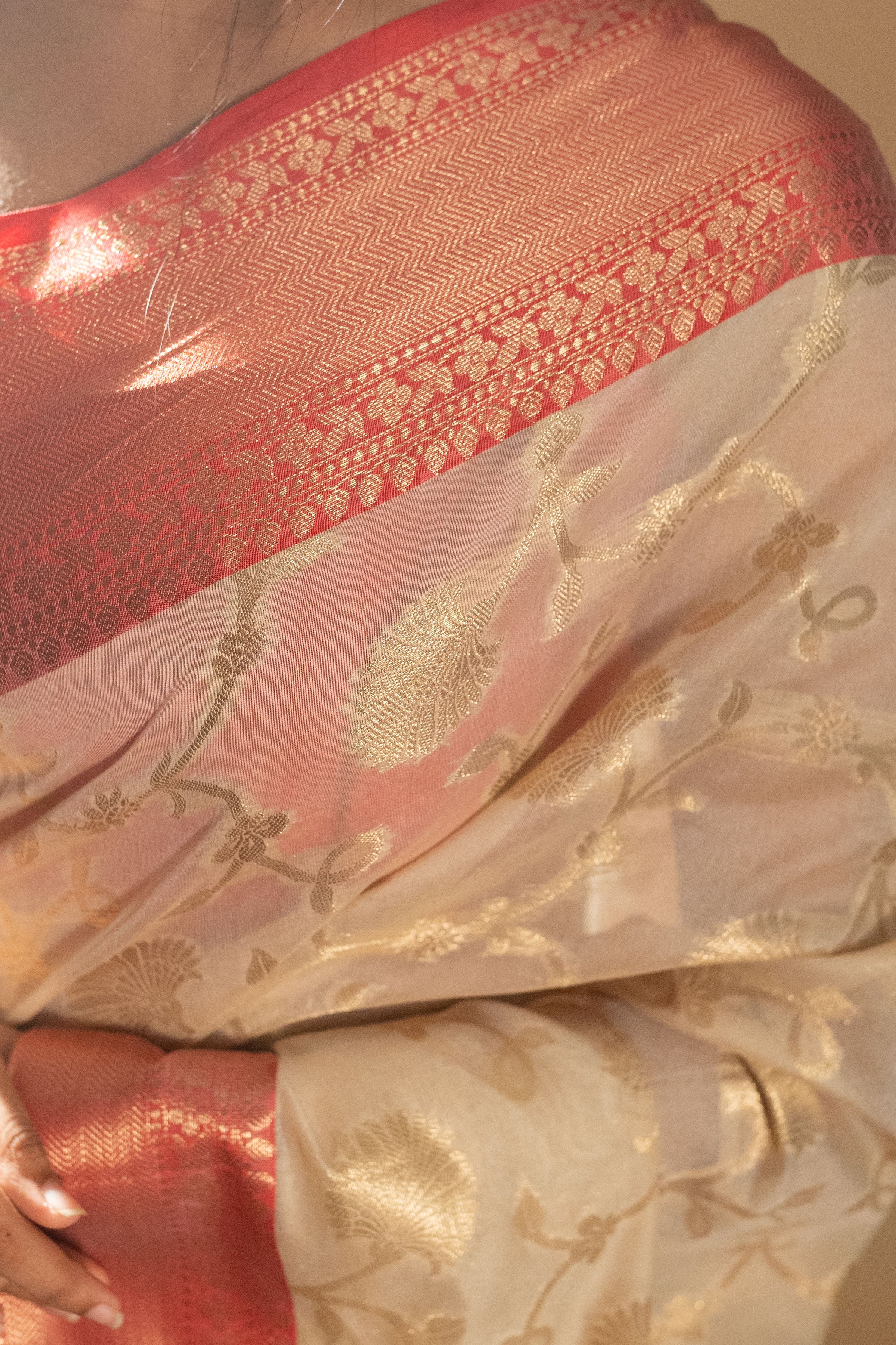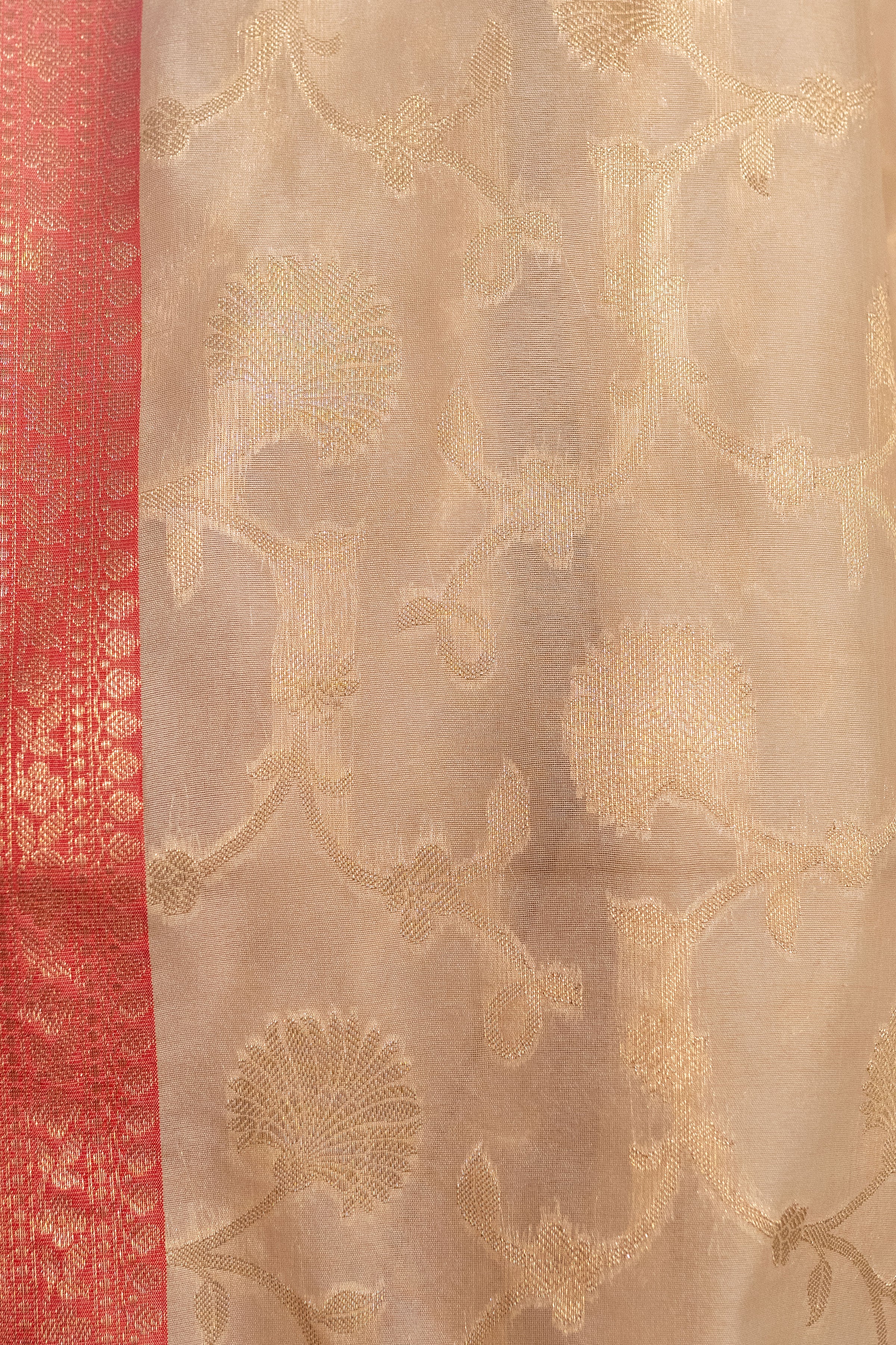 ● Perfectly crafted Semi Silk Bengali Design Off White Silk Saree for weddings and more special occasional celebrations.