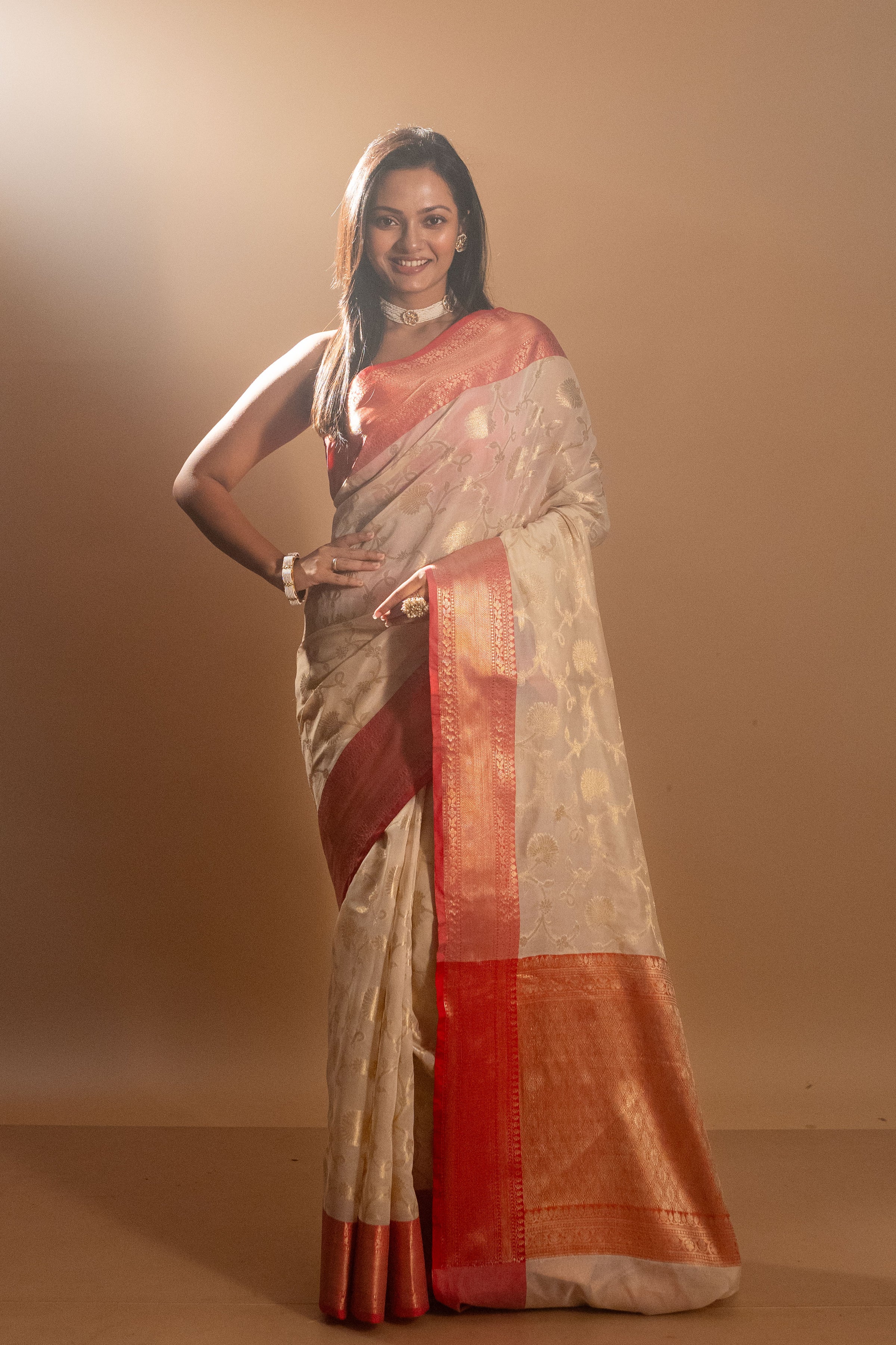 ● Elegant Semi Silk Bengali Design Off White Silk Saree with red border to attain a rich, classic, and attractive look.