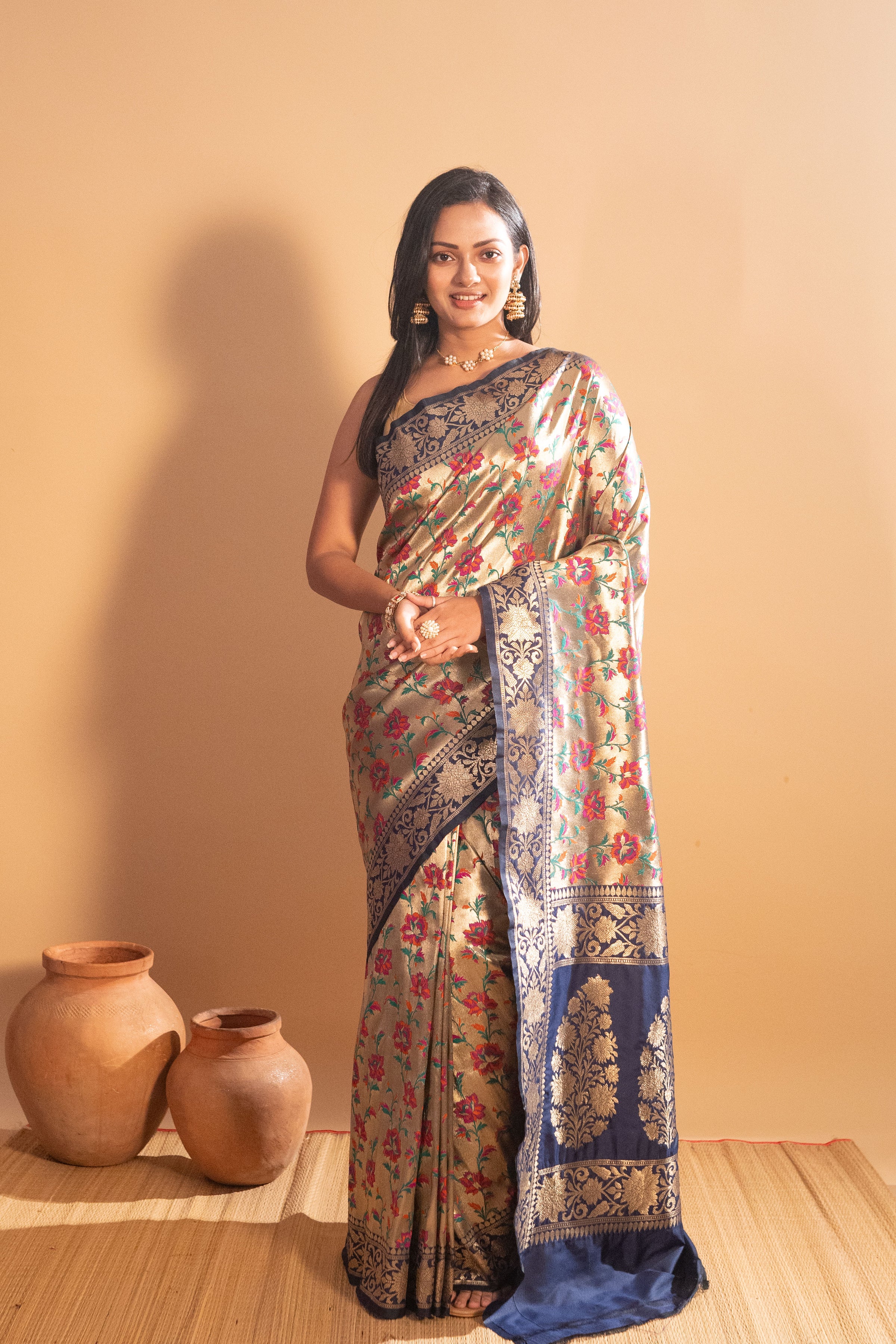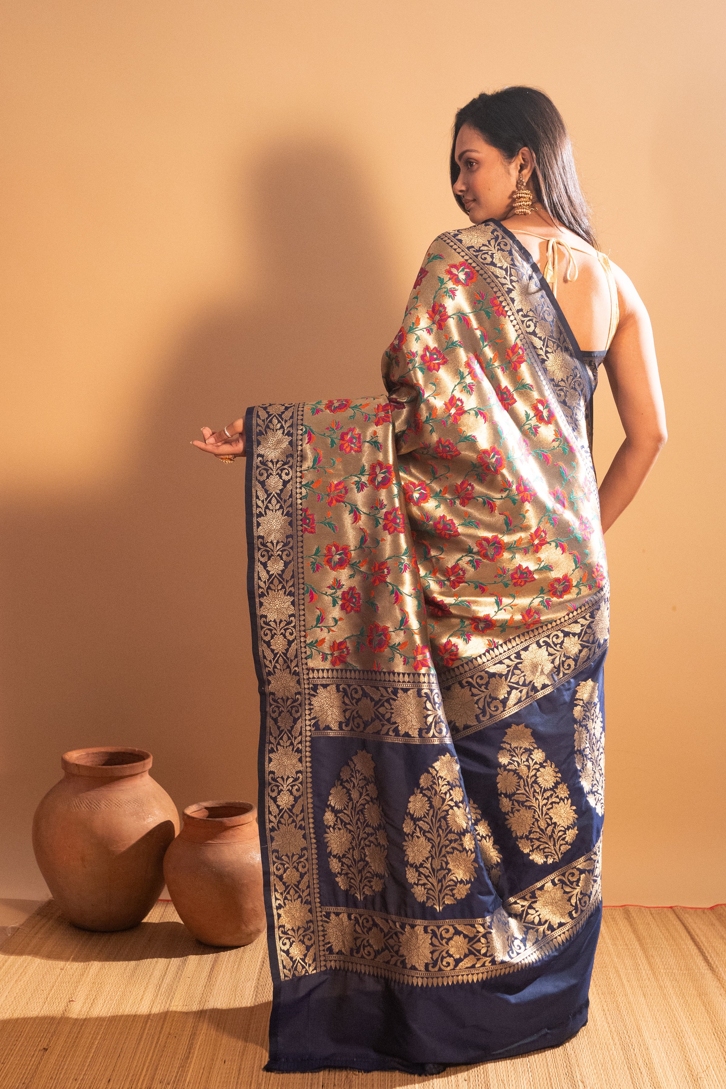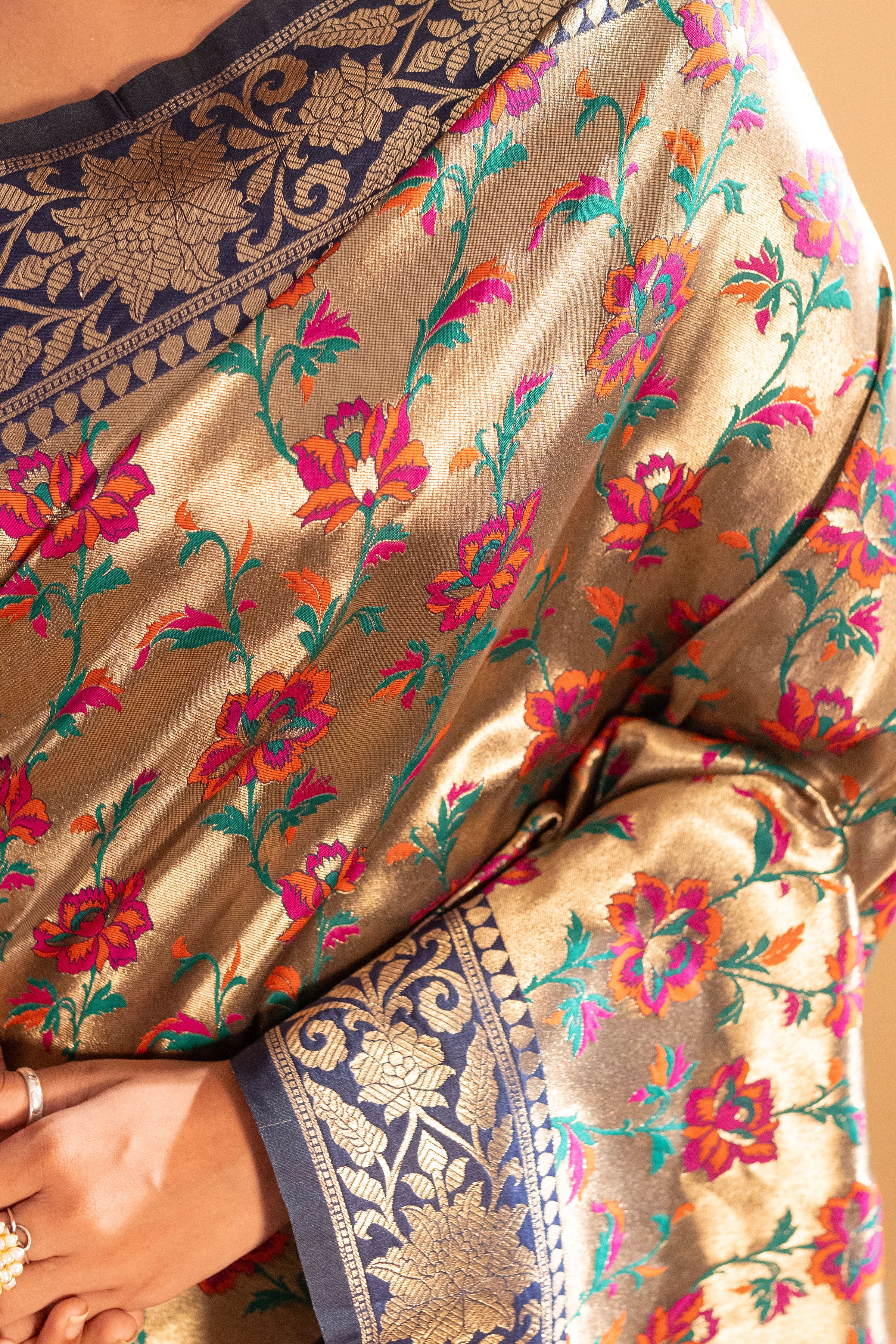 ● Elegant Banarasi tissue-embossed saree with luxurious detailing for a rich look.