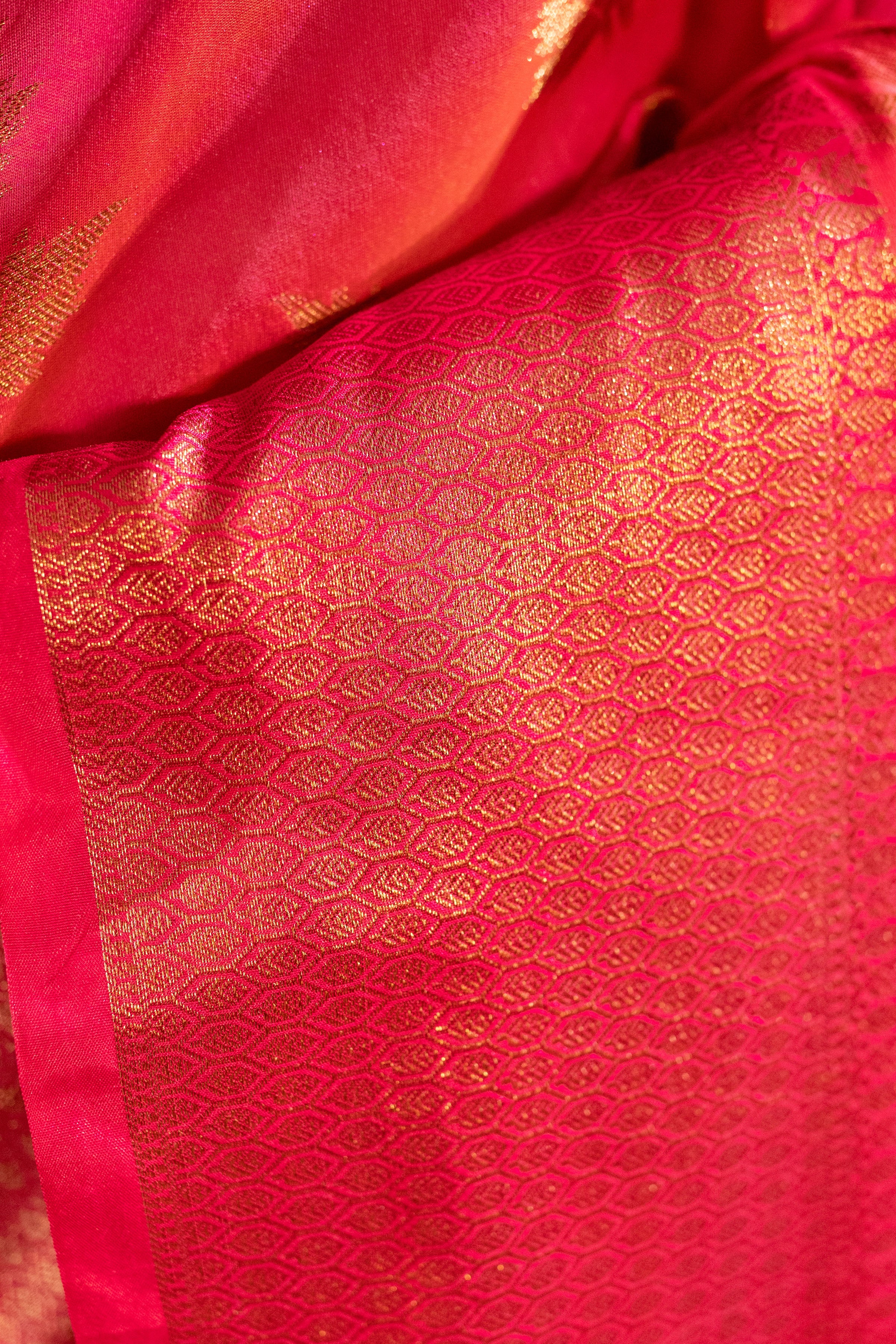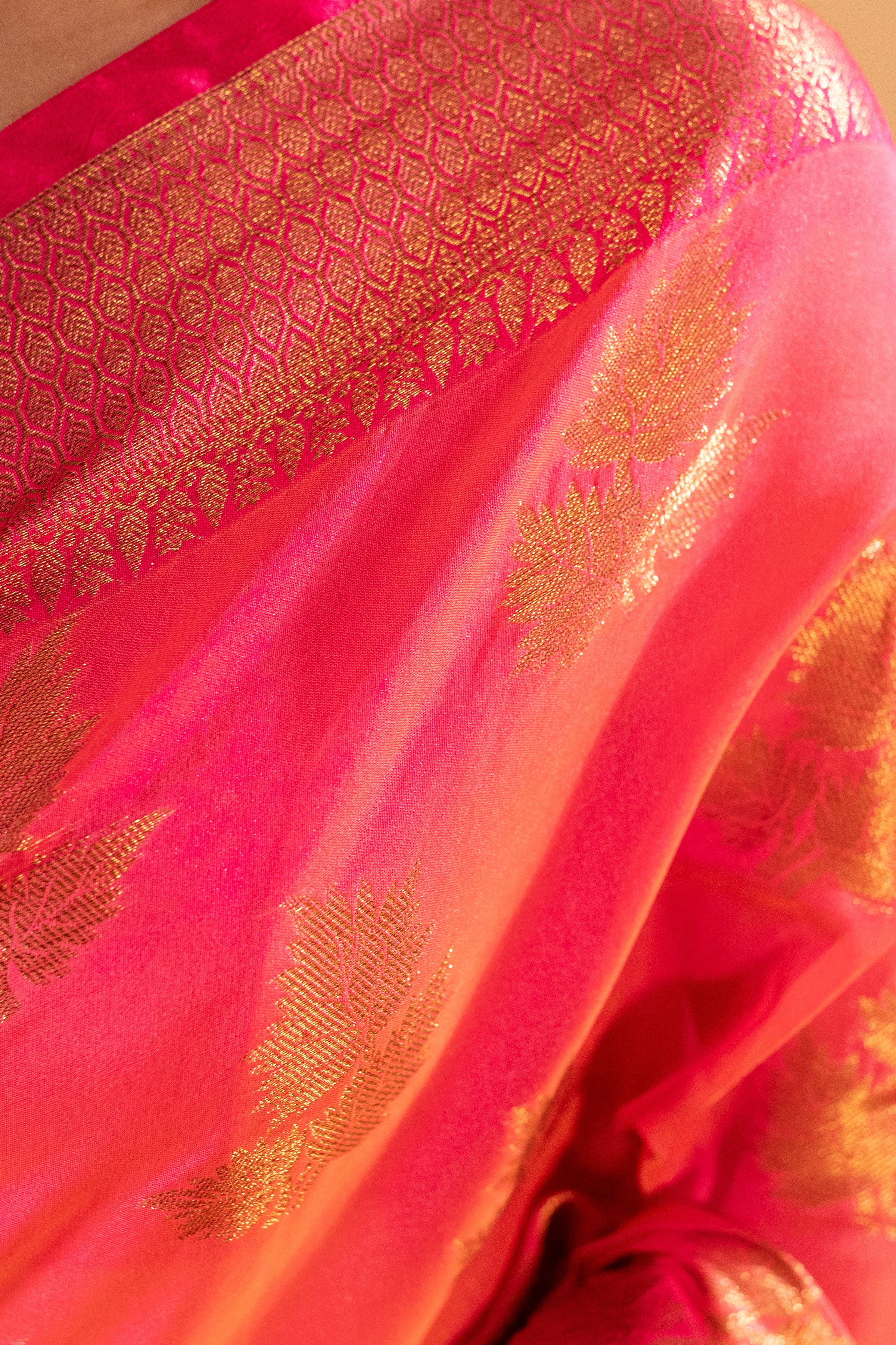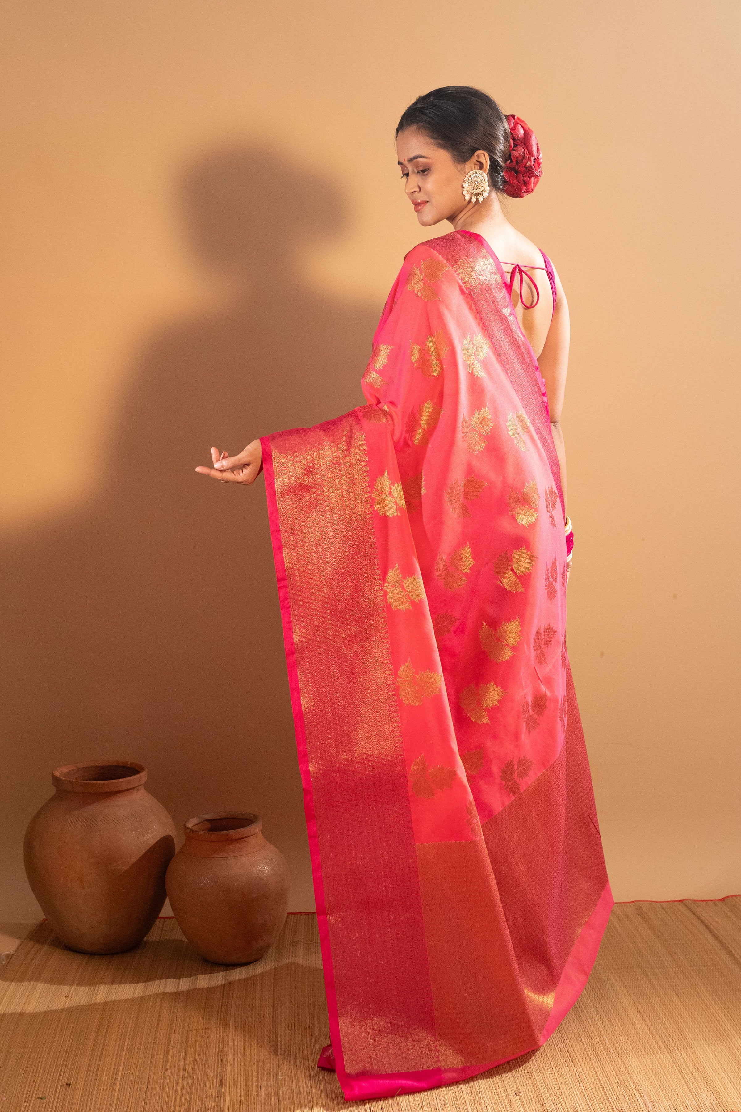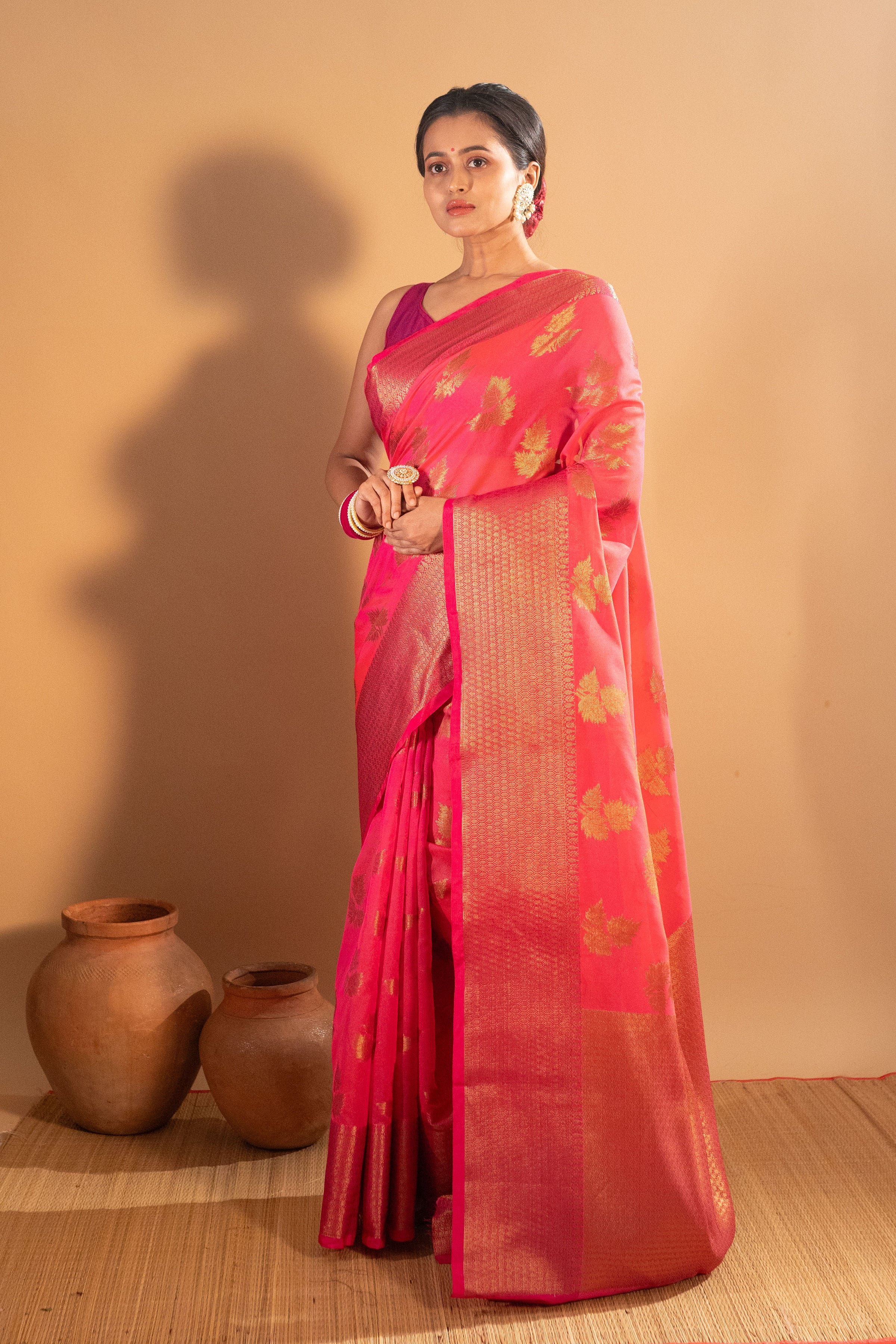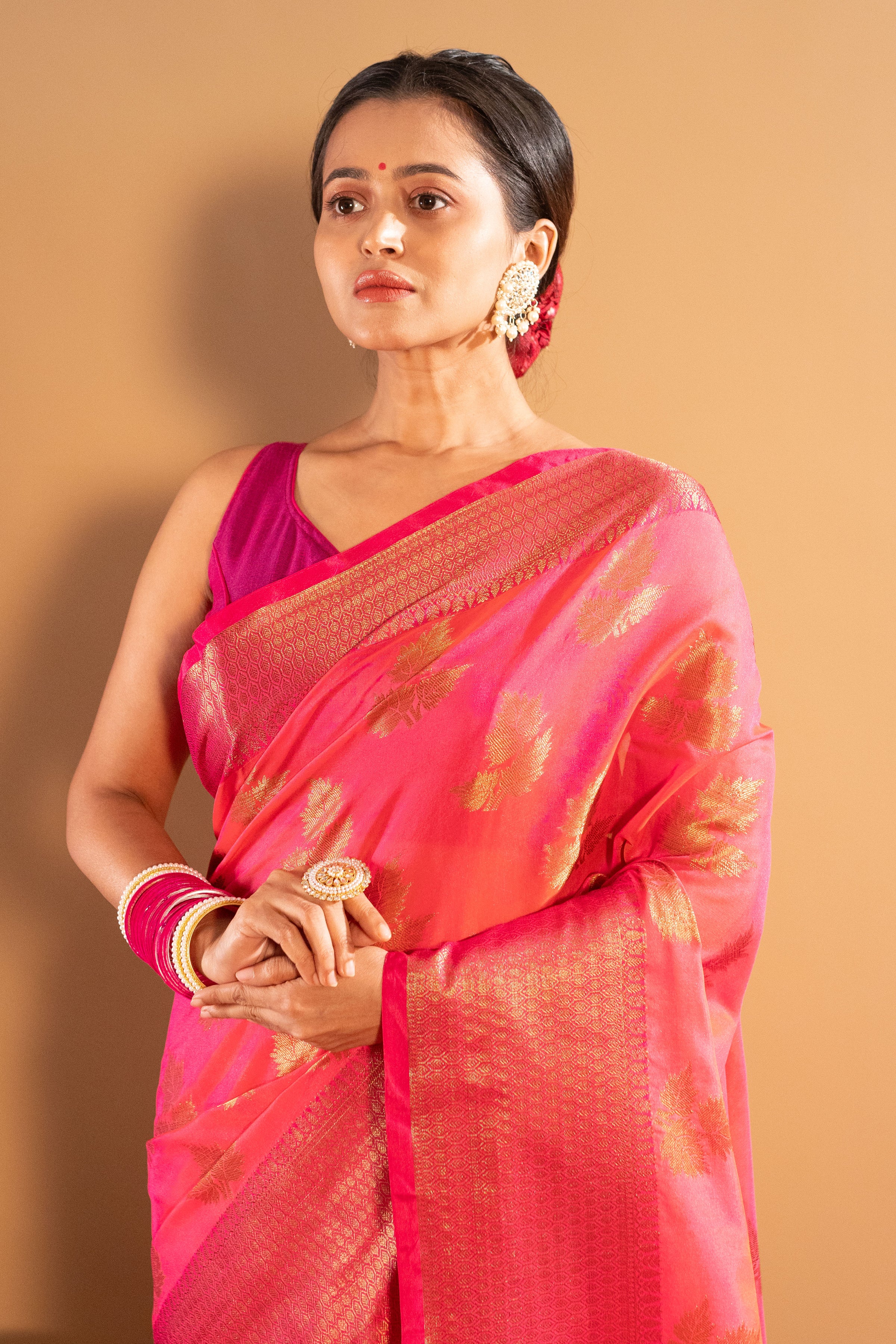Smooth fabric and soft shine, bring out your graceful style. With its premium pink shades, this saree provides you comfort, enriches beauty, and builds confidence.