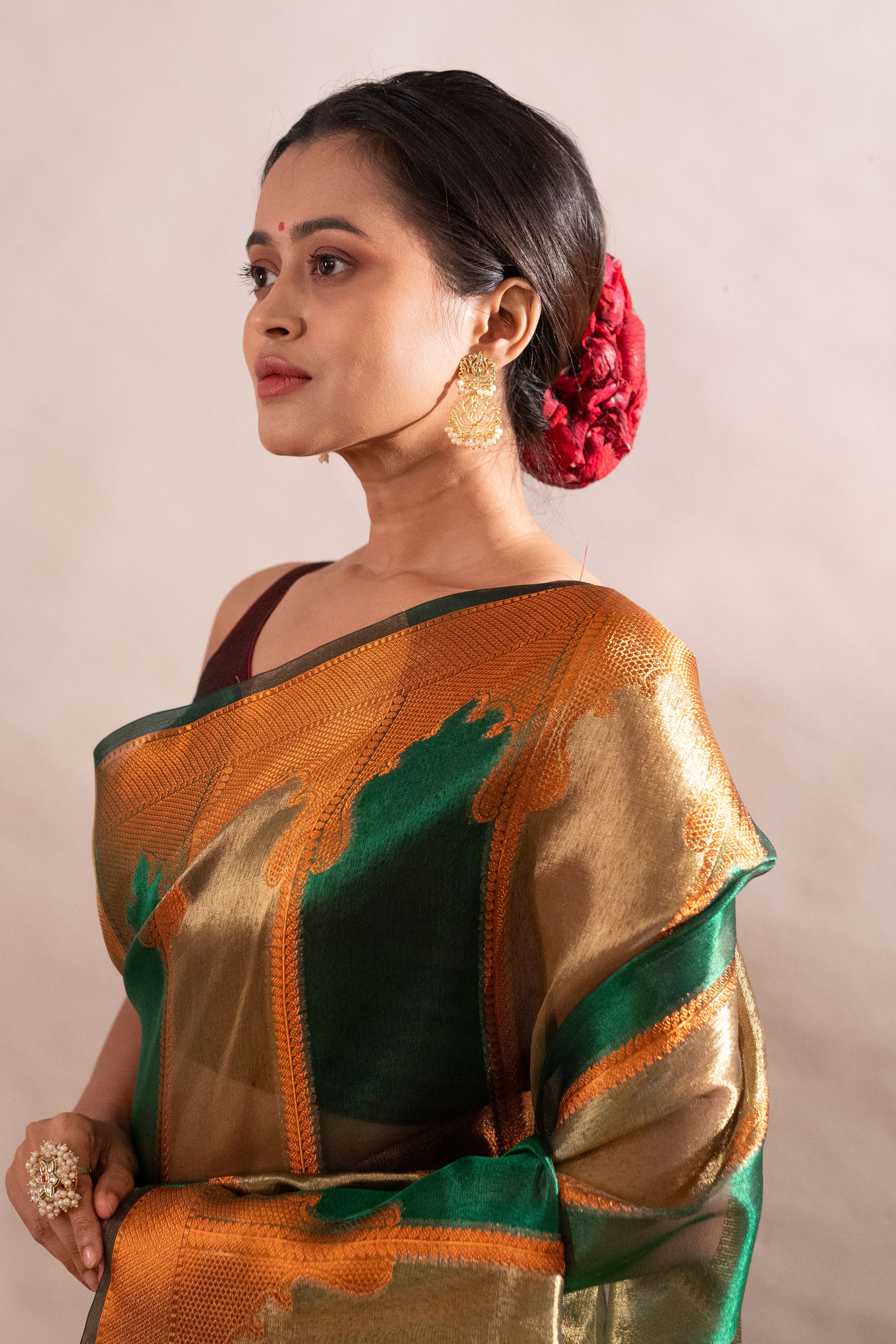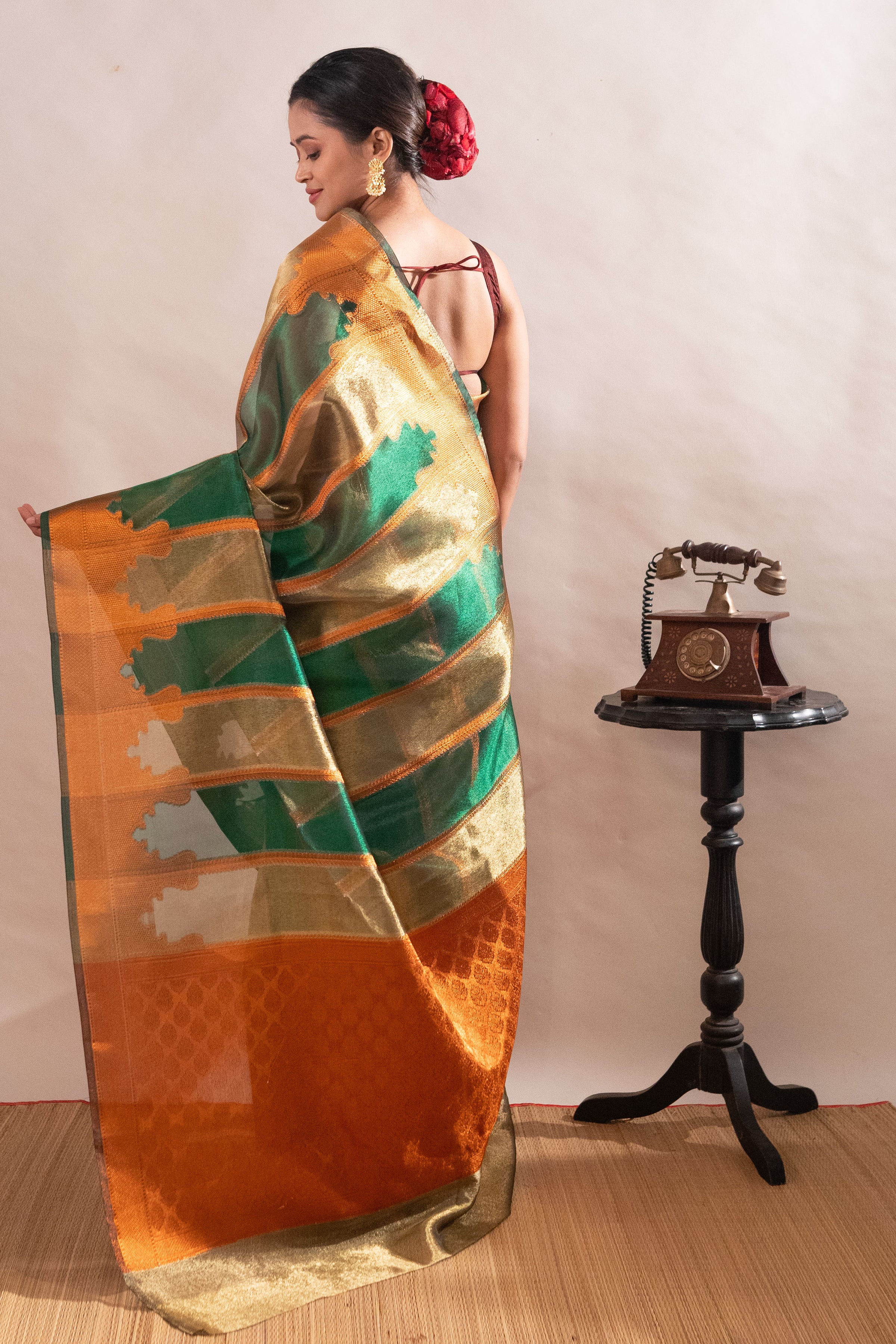 ● Crafted with handmade and premium Tissue Silk Saree Green Golden to offer a luxurious appearance.