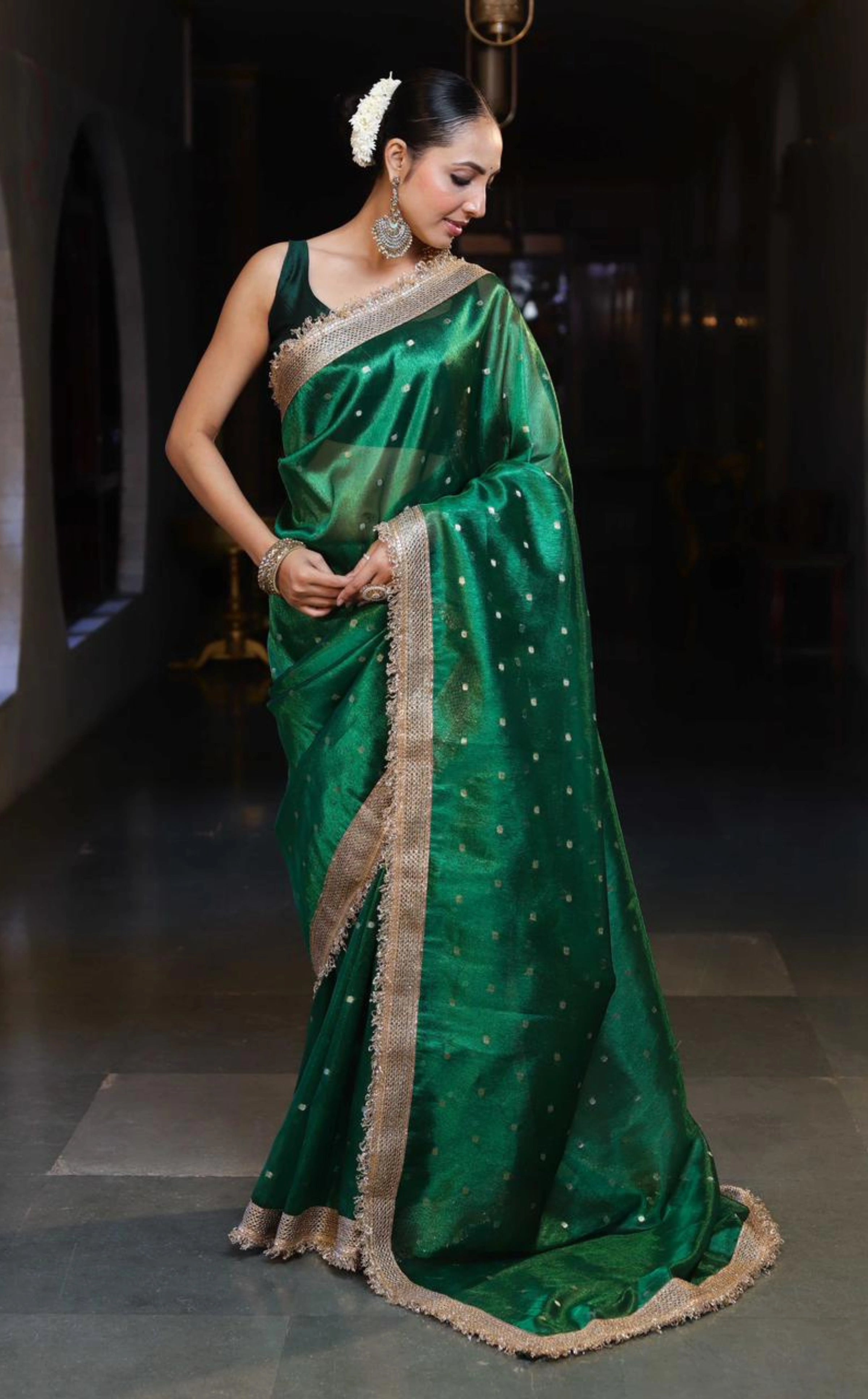 Give some festive freshness in your wardrobe with our Green Premium Tissue Silk Saree-beautifully adorned with artistry of heritage and luxury. This saree has gold zari butis scattered all over, embellished further with specific borders on either side. It is very apt for parties, festivals, and family get-togethers.