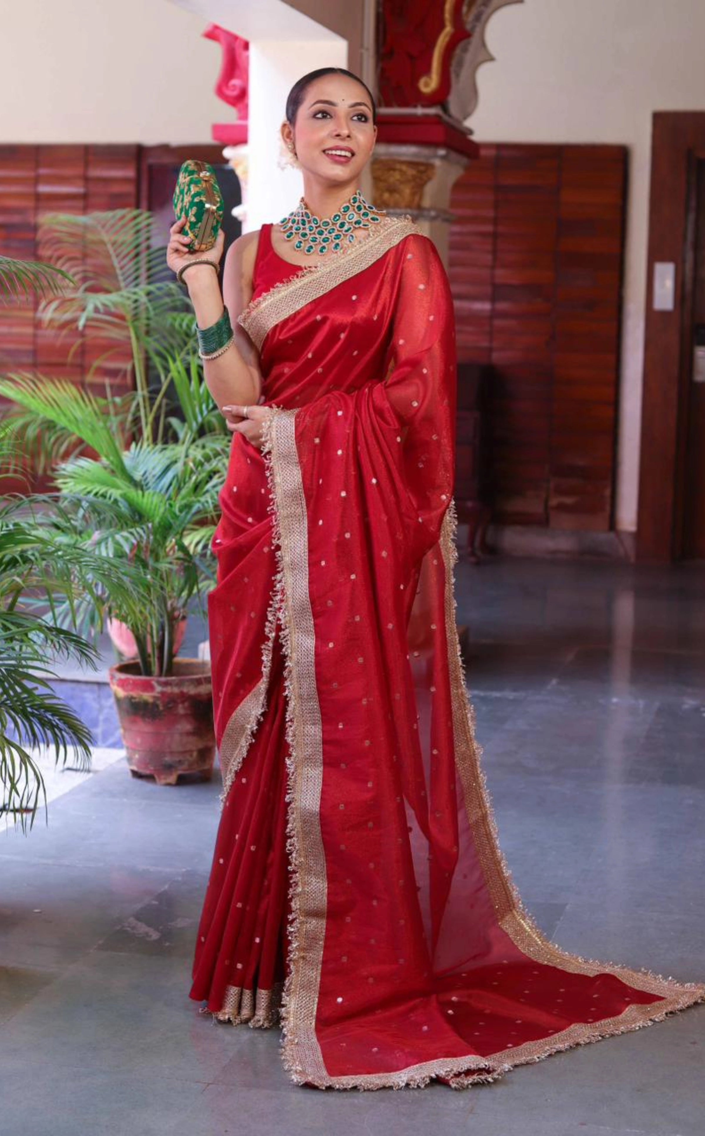 Enter into the enchantment of tradition and glamour; the irresistible tale of our Red Premium Tissue Silk Saree. The gorgeous red silk base, with gold zari buti all over, along with deeply woven pallu and rich zari borders, dresses up your festive grandeur.