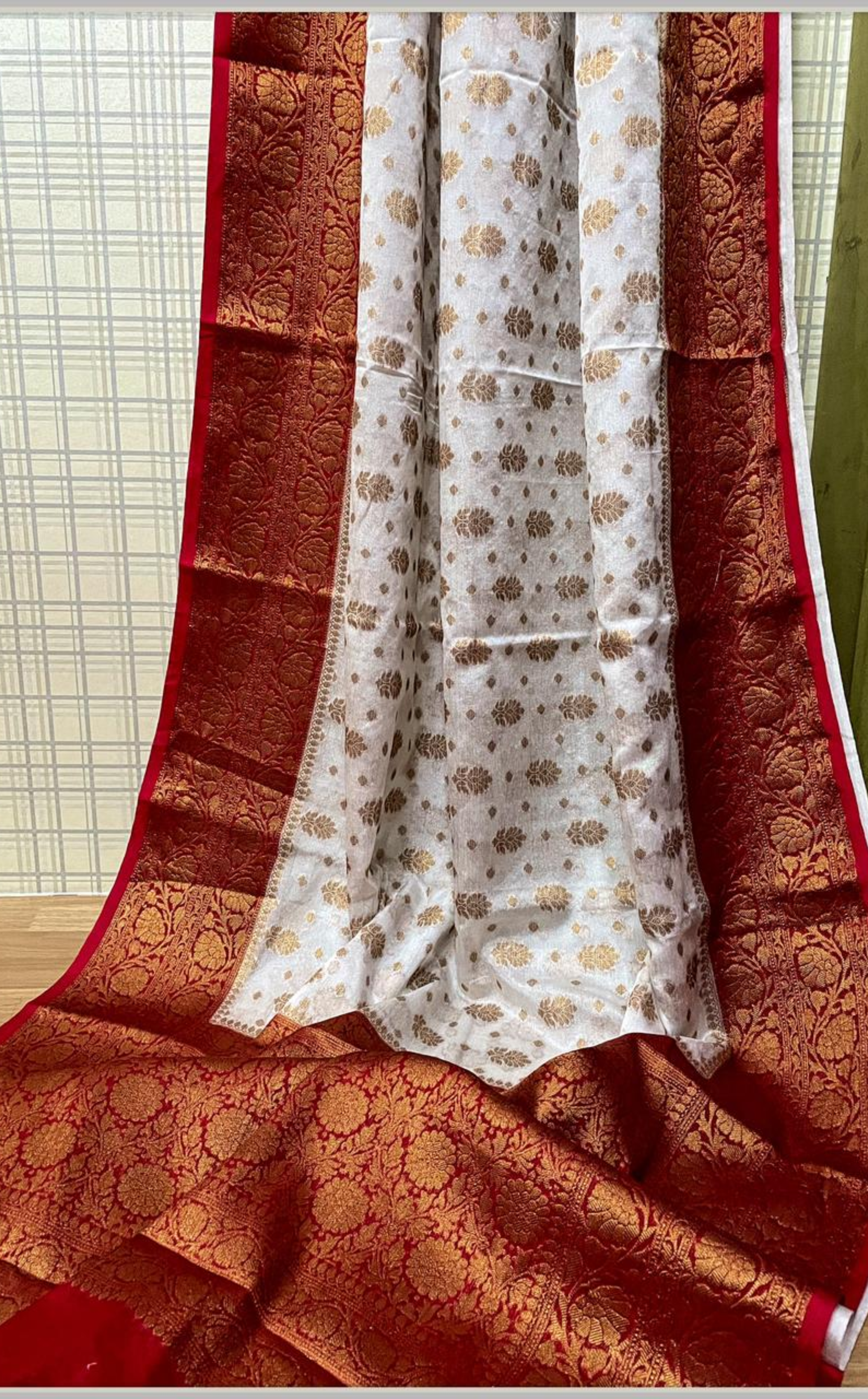 A pretty white SUTRANIYA semi Katan silk saree with a bright red border that looks stylish and attractive. The almand zari buti adds a lovely touch. Includes a matching pallu and blouse. The soft fabric feels comfortable and classy.